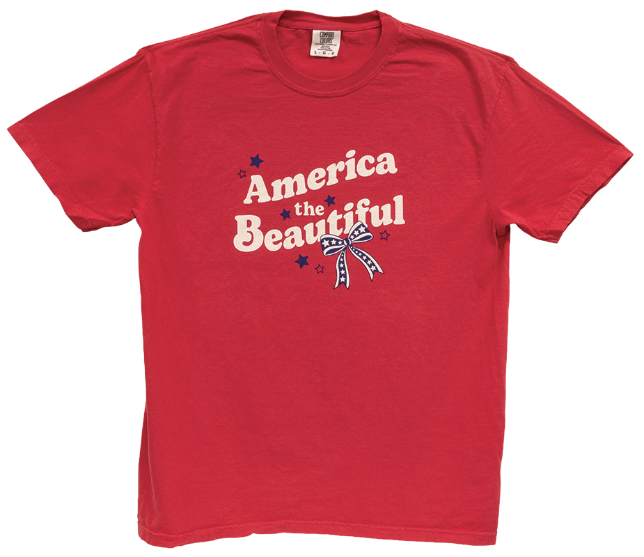 Bring sweet summertime style to a comfy, casual closet. The red tee is garment dyed with a sustainable process and soft-washed for a vintage inspired look and favorite-tee feel. White and navy blue design printed on the shirt reads “America the beautiful” and features star details and a striped bow. This shirt is crafted from 100% heavyweight cotton proudly grown in the USA. With a relaxed, oversized fit, the comfy shirt is available in adult unisex sizes S through XXL and was designed and printed in Ohio.