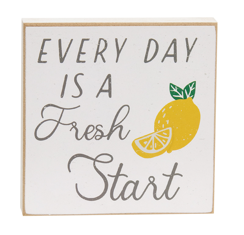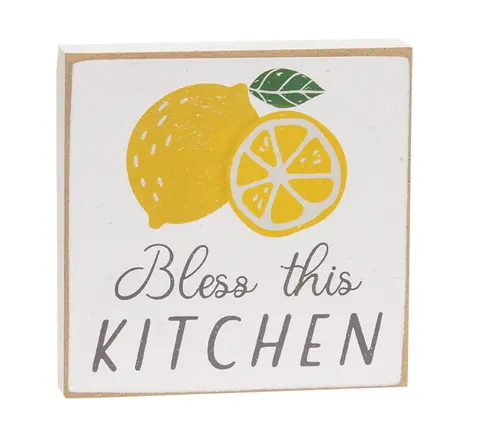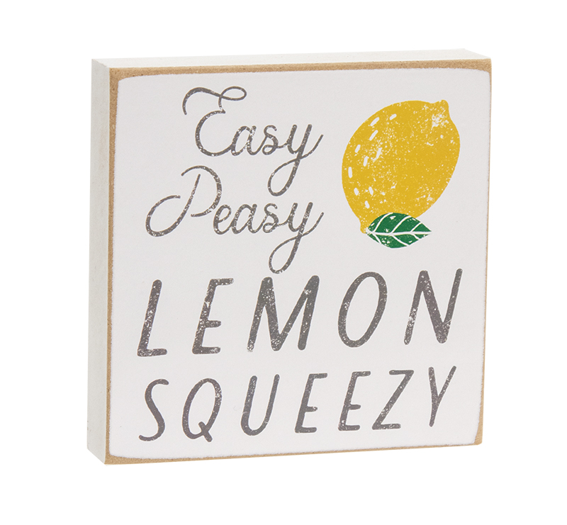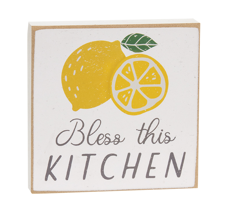 When life gives you lemons… make lovely displays! The Always Look on the Bright Side Square Block assortment features cute lemon graphics with phrases in gray text and script on white wooden blocks. The blocks have distressed edges and a keyhole hanger in the back but can also be displayed freestanding. One block reads ‘Always look on the Bright Side’ while another states ‘Bless this Kitchen.’ A third block states ‘Every day is a Fresh Start’ and the fourth reads ‘Easy Peasy Lemon Squeezy.’ These blocks look darling with grey and white buffalo check pillar candles and yellow beads or florals. They measure 4" square and .75" deep.