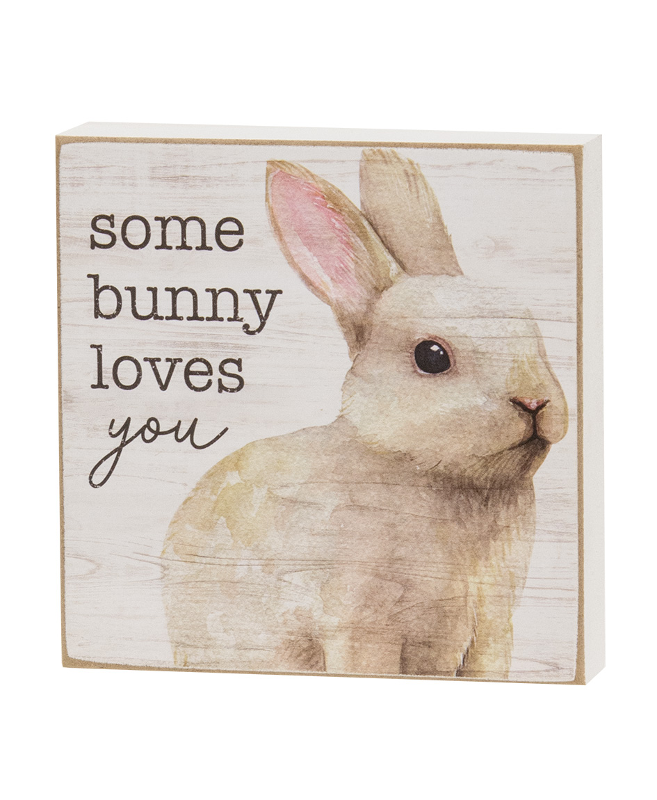 Every bunny in the farmhouse will adore the darling Bunny Love Square Block assortment. These cute 4" square wooden blocks have a .75" depth and can be displayed freestanding or hanging via the keyhole hanger in back. Each depicts a sweet watercolor style bunny on a white woodgrain background and words in dark gray text and script. One shows a cream bunny with upright ears and states 'some bunny loves you.' Another has a cute white rabbit with brown spots and reads 'peace love and easter blessings.' The third states 'there's no bunny like you!' with a gray lop-eared bunny. Pair one of these darling block signs with faux eggs or add to a Spring watercolor wall collage.