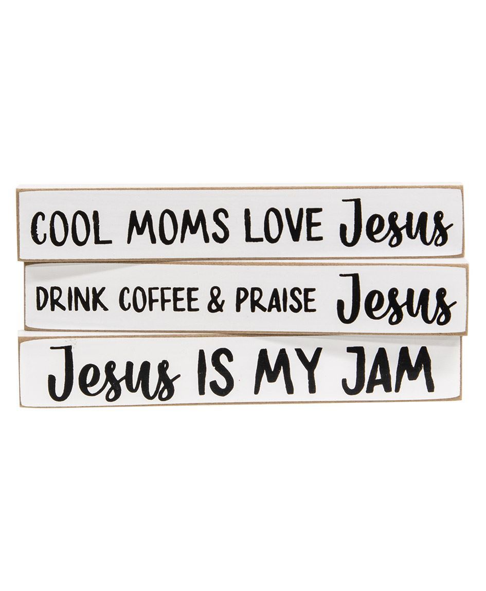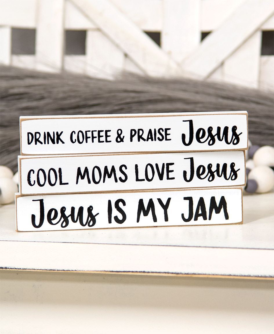 Bring Jesus to the forefront of the farmhouse with the Cool Moms Love Jesus Mini Stick assortment. These inspiring mini sticks sport black text and script on white, distressed backgrounds They measure 1" high by 6" wide by .5" deep and are made of wood. One block suggests ‘Drink Coffee & Praise Jesus’ while another proclaims ‘Cool Moms Love Jesus.’ The third block declares ‘Jesus is my Jam.’ These sticks look great with larger faith-based signs and gray pampas grass accents.