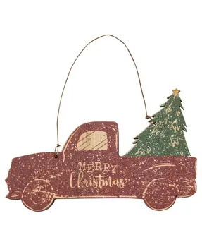 Update your holiday décor with a twist on the popular farm truck motif in the Home for the Holidays Truck Wood Sign. This sign features a 1970s-80s era bronco-style truck in red and white amidst a sea of snowy pines. A freshly cut pine tree is strapped to the top of the truck and the backseat is stuffed with presents. The scene has many fun details to discover like garland and ornaments strung along the side of the truck and a string of red and green Christmas lights along the front tether for the tree. This sign adds a lovely pop of color and a nostalgic feel to holiday décor and looks great hanging or sitting on the mantel with greenery. Measures 12.5" high by 18" wide with a 1" depth and has two sawtooth hangers.