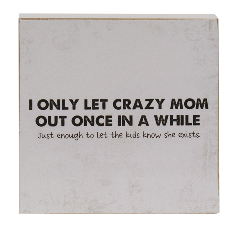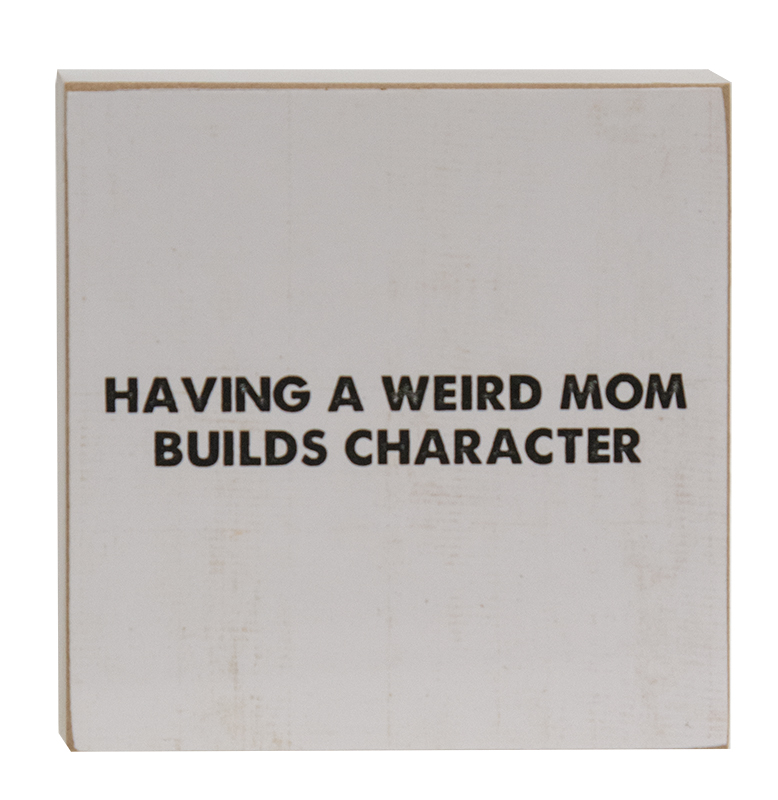 Embrace the craziness of motherhood with the Weird Mom Square Block assortment. These humorous blocks are solid wood with a distressed white background and simple black text. One reads ‘Having a weird Mom builds character’ and the other states ‘I only let Crazy Mom out once in a while - Just enough to let the kids know she exists.’ The blocks measure 4" square with a .75" depth and can be displayed freestanding or hanging using the keyhole hanger on the back. These blocks make a great addition to playful family displays or Mother’s Day displays.