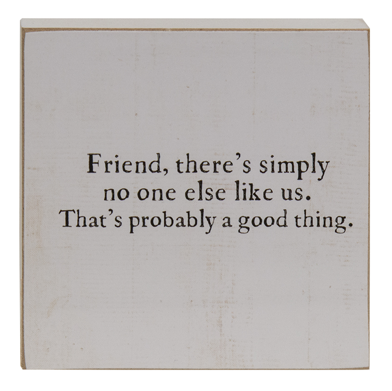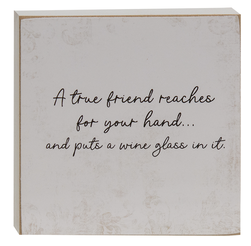 Celebrate your friendships with A True Friend Square Block, 2 Asstd. These white distressed wooden blocks have fun sayings about friendship in black script or text. One is written in script and reads ‘A true friend reaches for your hand… and puts a wine glass in it.’ The other has black text reading ‘Friend, there’s simply no one else like us. That’s probably a good thing.’ These blocks would be great to give to any friend as a gift. These blocks sit 4" by 4".