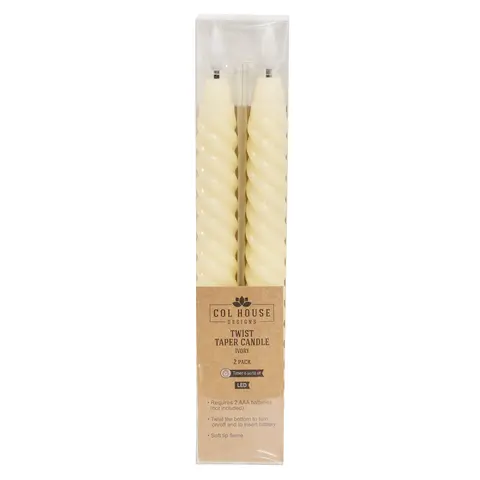 Bring a classic feel to Everyday displays with the Ivory Twisty Timer Tapers - 10"H set. Made of wax, this pair of ivory-colored candles has a twisted design and flame-shaped lights attached to black stems. Each candle measures 10" tall with a 1" diameter and requires 2 AAA batteries (not included). They have a 6-hour on, 18-hour off timer feature. These tapers have a glossy finish and would look great paired with beaded garlands, box signs, or florals from every season. Meant for indoor use only.