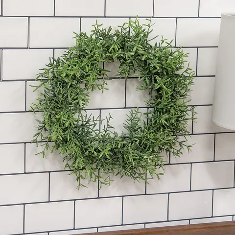 The Dusty Rosemary Candle Ring offers a touch of old-world appeal for the home. This decorative floral ring features lush stems of faux rosemary leaves on a green plastic base. The leaves vary in color from deep green at the base to light at the tips, and have a dusty looking finish. This simple ring looks elegant displayed on a table paired with a candle or vase, or hanging on a wall or hook as a miniature wreath during spring or year-round. Measures 6.5" inside diameter by 10.5" outer diameter.