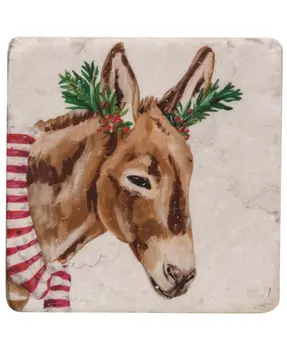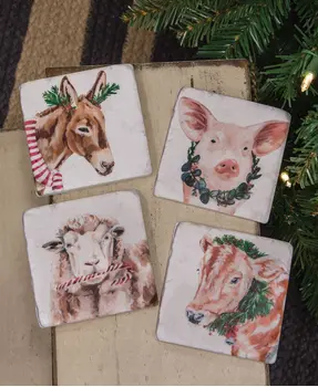 Add a touch of festive cheer to the holiday table with the Wooden Plaid Christmas Coasters with Holder set. Each set includes four charming coasters, each featuring a unique plaid design in shades of green, white, and red. The coasters are adorned with simple cream-colored text, with phrases like "Joy to the World," "Merry Christmas," "Season’s Greetings," and "Peace on Earth," making them a delightful seasonal accent. Measuring 4" in diameter and .25" thick, these coasters are crafted from durable wood with soft foam pads on the bottom to protect furniture. The set also comes with a stylish green wooden holder that keeps the coasters neatly organized when not in use. Whether serving holiday drinks or just adding some festive flair to décor, these coasters bring warmth and seasonal spirit to the farmhouse.