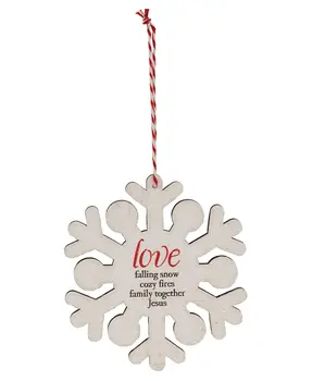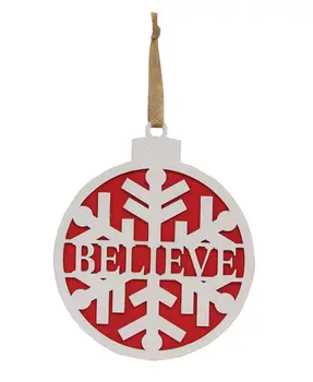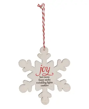 Snowflakes and shimmer fill up the farmhouse this Winter with the Wooden Sparkle Snowflake Winter Word Bulb Ornament assortment. These delightful wooden ornaments feature a classic holiday bulb shape with a jute hanger at the top for easy display. They have bright red backgrounds with white glittery snowflakes layered over top. Each snowflake is unique with a word cut through the center. The words include 'Joyful,' 'Believe,' and 'Hopeful.' These ornaments will dress up the farmhouse Christmas tree or add some glittery sentiment to hooks on the mantle or a festive garland. Ornaments measure 5" high by 4" wide by .25" thick.