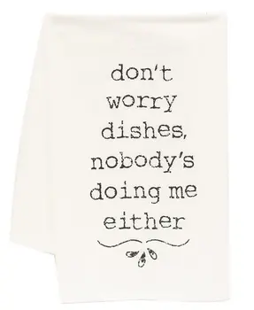 Bring a bit of humor to the farmhouse kitchen with the When I Bought These Vegetables Dish Towel. This white cotton towel pokes fun at failed attempts at healthy eating with the phrase ‘I wish I was the person I thought I’d be when I bought all these vegetables.’ Line drawings of various veggies frame the phrase at the top and bottom and the black lettering is embellished with small white accents. The towel measures 28" square and makes a fun addition to kitchen themed displays.