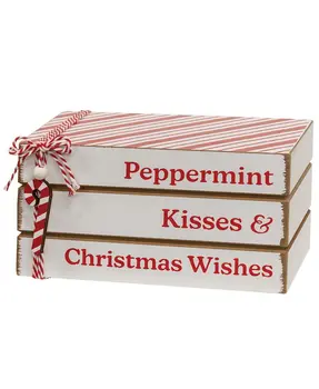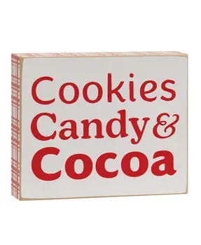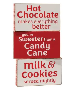 Bring sweet delight to the farmhouse this holiday season with the Candy Canes, Hot Chocolate or Cookies Sign Ornament assortment. These festive red and white ornament signs are made of wood topped with red and white twisted string hangers. They measure 4" high by 6 wide with a .25" depth. One ornament has red text on a white background and reads 'Christmas Cookies - Santa’s Favorite! - 10¢ - Fresh Baked!' Another has white text on a red background and states ‘Candy Canes - the North Pole’s Finest - 5¢.’ The third reads ‘Hot Chocolate - 25¢ - includes marshmallows’ in red on a white background. These ornaments look great on the tree as larger focal pieces or are darling hanging on the mantel with stockings.