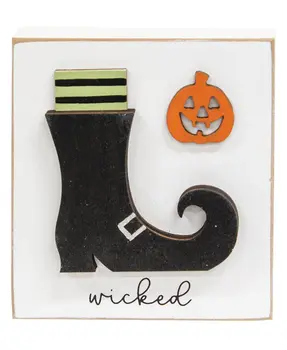 Create enchanting Halloween displays with the Cheers Witches Block with Witch Hat. This wooden block measures 4.5" high by 5" wide by 1" deep. The base is a wooden block in orange with a black broom cutout that reads ‘Cheers witches’ in black script. Fixed atop the base is a black wooden witch hat with green band and silver buckle. The sitter has distressed edges and looks charming with other witch-themed sitters or any of our orange Halloween decor.