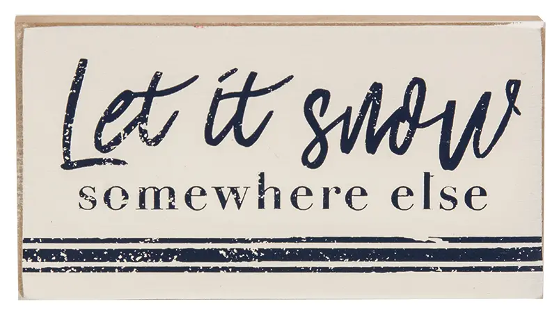 Give Winter the cold shoulder with these sassy, hilarious blocks.The So Cold Pinstripe Blocks feature three winter-themed phrases in navy blue text and script on an ivory background. Phrases include “I am so freakin’ cold,” “’tis the season to be freezin’” and “Let it snow somewhere else.” A navy blue, triple-stripe frames the bottom of each message. Raw edges and distressing on the design give these signs a rustic look that will fit well with any winter, farmhouse décor. These blocks include two keyhole hangers on the back and can also be displayed freestanding. Blocks measure 3" high by 6" wide by .75" deep.