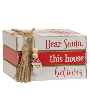 Make the farmhouse merry and bright this holiday with the Merry & Bright, Believe, House Wooden Blocks set. These darling wooden blocks feature two signs and one house sitter with a red and white color scheme and distressed edges. One block measures 3.25" high by 3.5" wide and reads ‘Merry & Bright’ in red script and text. Another reads ‘believe’ in red script with holly berries and leaves accenting the text. It measures 2" high by 6.5" wide. The red house sitter measures 3" high by 2.75" wide. It depicts a wreath on the front door, a tree in the front window and Christmas lights along the roof. The blocks have a .75" depth for sturdy display and they look great with icy greenery or as part of a table top display.