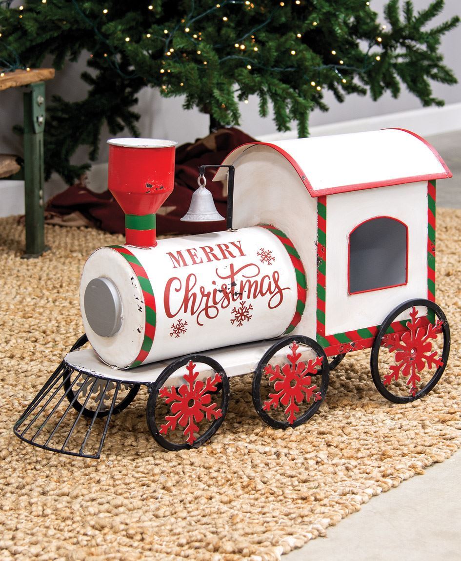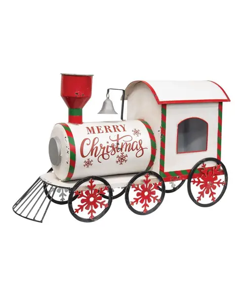 Merry Christmas Train is the perfect vintage accessory for the farmhouse with its old-fashioned feel and charming details. The metal train boasts classic white, red, and green Christmas colors and reads, "Merry Christmas" in red lettering. This old fashioned accessory looks darling in entryways or covered porches. It measures 15.75" high by 8.75" wide by 26" long and has the realistic look of an old-fashioned train.