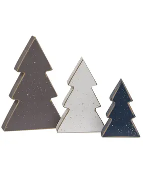 Suitable for multiple home decor styles, the Rustic Wood Country Trees convey the beauty of winter days with their cool color scheme. The set of three wooden trees have distressed colors ranging from slate blue, white and chocolate brown. Ranging in sizes, the set of rustic trees may be displayed individually or as a set. The large tree measures 8" high by 4" wide by 1.5" deep. The medium tree measures 6" high by 3" wide by 1.5" deep. The small tree measures 4" high by 2.5" wide by 1.5" deep.