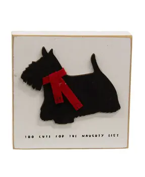 Remember that Santa isn’t just for little kids anymore with the Santa Paws Scotty Dog Ornament. This darling ornament is wood with a black finish and shaped like a Scottish Terrier with a bight red felt scarf. The scarf has a little wooden tag that reads ‘Santa Paws’ and the ornament is topped with a black and white gingham ribbon. This ornament looks great on the tree or hanging with black and white decor and Winter red berries. Measures 4" high by 4.5" wide with a .25" depth.