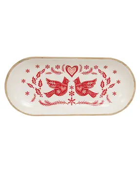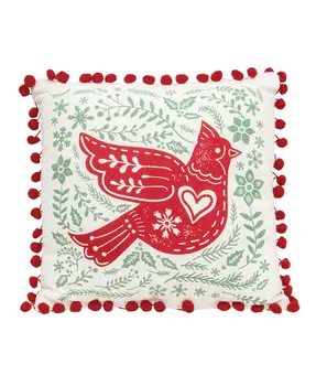 Bring a pop of color to any space with the Yuletide Folklore Dove Pillow. This red cotton pillow measures 12” square and 3” thick and is lined with white pom poms. It features a large distressed white dove illustration with a heart, snowflakes, and greenery. A pattern of green winter florals, snowflakes, and greenery surrounds the dove and fills the background. This colorful pillow looks great when paired with accentuating furniture, candy cane, or hot cocoa décor.