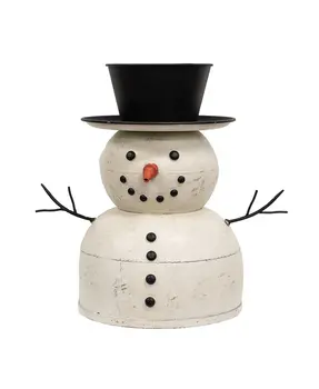 Add a whimsical touch to farmhouse Winter decor with the charming Distressed Metal Standing Top Hat Snowman! Standing tall at 21”, this delightful snowman is crafted from durable metal, featuring a large jingle bell as his plump body and long, slim legs that end in oversized boots. Embossed black circles make up his eyes, jacket buttons and cute smile and his face is finished with a traditional orange carrot nose. His classic black top hat, with an open top, offers a wonderful opportunity to personalize with florals, greenery, or seasonal accents. The weathered finish gives this snowman a rustic, vintage appeal. Whether placed by the front door, in a holiday centerpiece, or as part of a larger winter wonderland scene, he’s sure to spread cheer and bring a smile to anyone who passes by!