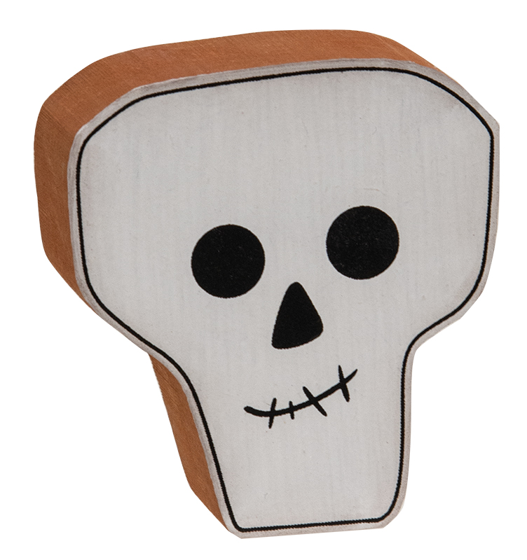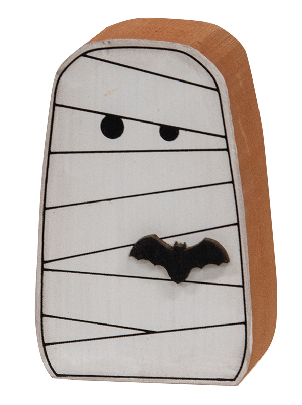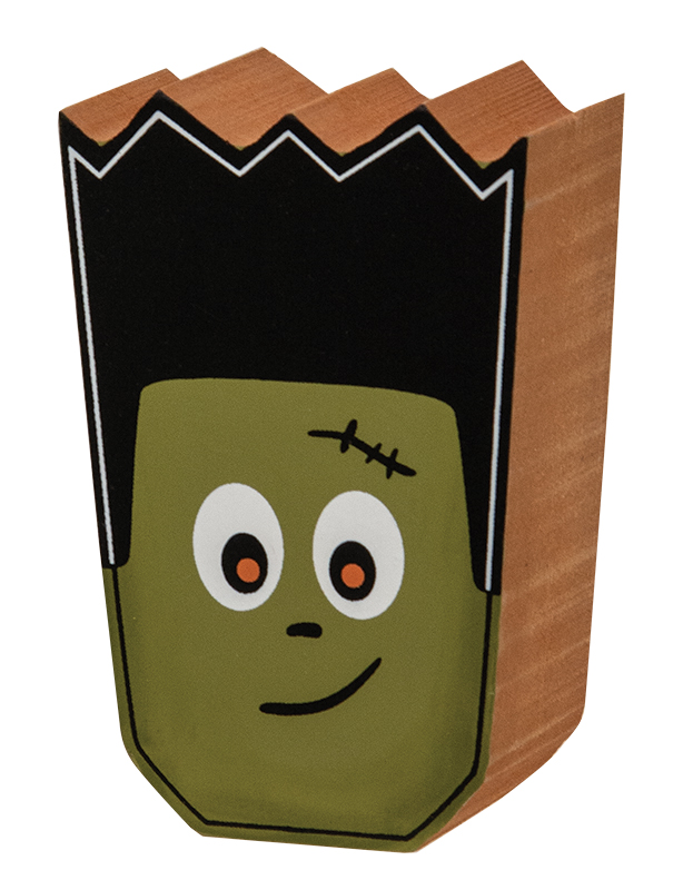 Create some monstrously good displays this Halloween with the Extra Chunky Monster Sitter assortment. These fun chunky sitters are 1.25" thick and made of solid wood with raw edges. There's a white skull with black facial features and a cute smile. It measures 3.25" high by 3" wide. Frankenstein's monster has a green face and spiky black hair and measures 3.25" high by 2.25" wide. The third monster is a rounded wrapped mummy in white with black details and a layered black bat. It measures 3" high by 2" wide. These monster sitters look darling on a tiered tray display or simply added to a grouping of plush pumpkins or orange and black pillar candles.