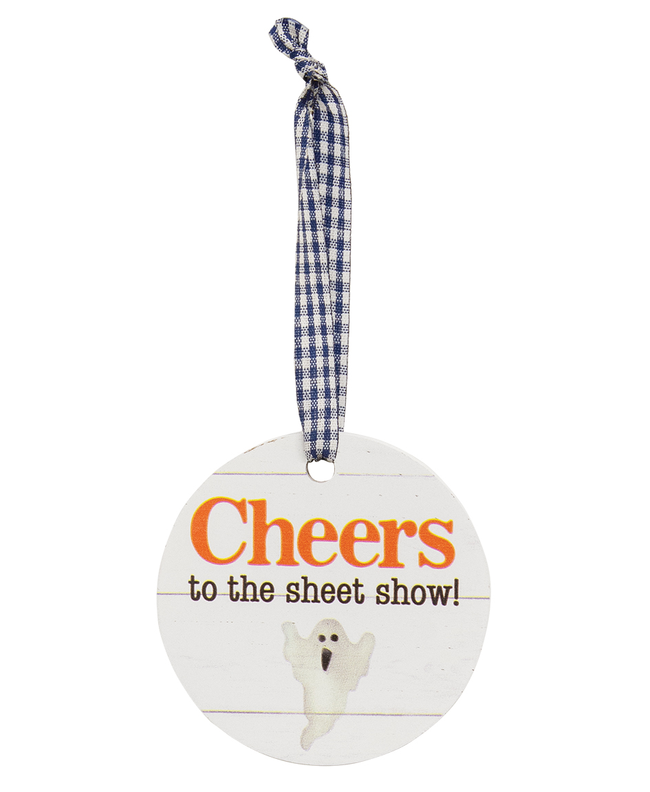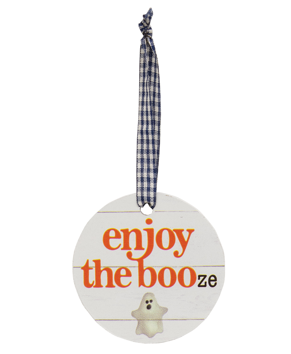 Halloween will be all cheers and boo-ze with the Enjoy the Booze Halloween Wine Tag assortment. These humorous round wooden tags feature a white shiplap background and are adorned with black gingham ribbon hangers for a rustic, farmhouse-inspired look. Each tag showcases a whimsical watercolor ghost and a lighthearted, spooky phrase. One tag reads, "Cheers to the sheet show!" another says, "Ghosties forever." A third tag playfully states, "Sheet happens, here’s some wine," while the last one invites, "Enjoy the boo-ze." These fun, 3” wine tags bring an extra dose of personality and humor to Halloween gatherings, making them a delightful addition to any bottle of wine or beverage for festive celebrations.