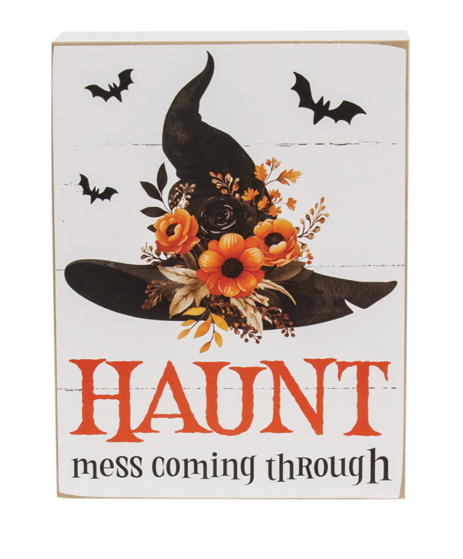 If you’ve got it, haunt it with the Wicked Haunt Floral Witch Hat Box Sign assortment. These charming blocks have playful phrases in black and orange text accenting elegant witch hats with black bats flying in the background. The blocks measure 8" high by 6" wide by 1.5" deep and are freestanding. One block reads ‘Haunt mess coming through’ and sports a black hat with a swooping pointed tip and a mix of Fall greenery with orange poppies and a black rose. The other block has a black hat with a tip that cascades down and curls at the end with floral accents including black and orange pumpkins and chrysanthemums. It reads ‘something Wicked this way comes.’ Accent one of these blocks with a couple black taper candles and small spray of Fall florals for an enchanting display!