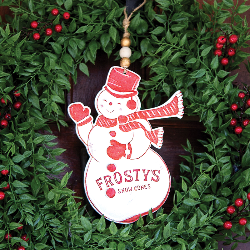 Say "snow way" to mediocre displays this Winter with the Frosty's Snow Cones Metal Snowman Hanger. This adorable hanger is made of metal and depicts a cheery smiling snowman in white with red accents. The snowman has a top hat, scarf, ear muffs and mittens and reads 'Frosty's Snow Cones' in red text. It is topped with a jute hanger with one white and two gold wooden beads. It measures 8.5" high by 6" wide and looks darling hanging in the center of a wreath or from a Winter garland.