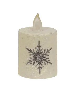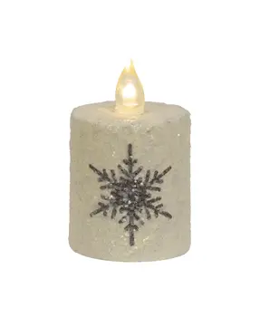 Let it snow in the farmhouse this Winter with the Glitter Snowflake Timer Pillar, 2"x 3". This darling plastic pillar candle is topped with a silicon flame with a warm-toned light. The pillar has is painted in white distressed paint with a large gray snowflake design and glitter finish. The candle requires 2 AA batteries (not included) and has a 6-Hour on, 18-Hour off timer feature. Add this candle to Winter displays for a little sparkle and a flickering warmth.