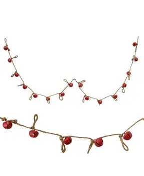 Bring beautiful musical tones to farmhouse decor with the Golden Sleigh Bells Door Hanger. The lovely dark red faux leather hanger measures 33" high by 3" wide by 2" deep. It sports four golden jingle bells spaced along the length and has a thin gold metal buckle at the top as a hanger. This hanger looks lovely hanging on a door or wrapped within a Winter garland for a pretty look.