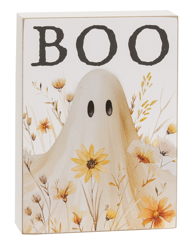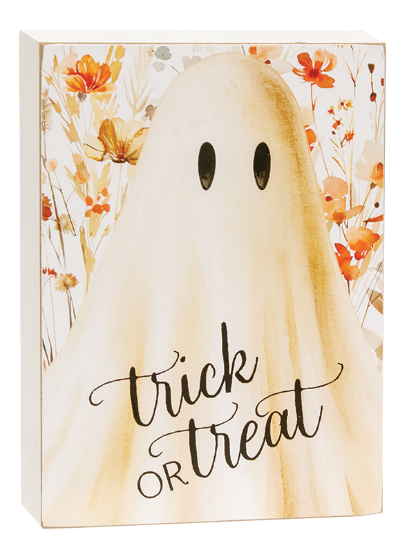 Spooky meets sweet with the Golden Fall Wildflower Ghost Box Sign assortment. Add a whimsical touch to farmhouse Halloween decor with these 7” high by 5” wide by 1.5” deep wooden box signs featuring charming ghosts adorned with delicate watercolor wildflowers in golden autumn hues. Each sign carries its own festive message: one reads "Boo," another "Trick or Treat," and the third says "Happy Halloween." Create a lighthearted, seasonal display with these fun Halloween sighs with an artistic twist. With their neutral white background and colorful, nature-inspired accents, they pair beautifully with a variety of Fall decor.