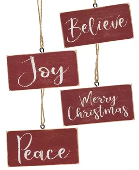 Bring lovely sentiments to the farmhouse this holiday season with the Holiday Script Red Word Block assortment. These solid wooden blocks feature inspiration words or phrases in distressed white script including 'Joy,' 'Peace,' 'Believe,' and 'Merry Christmas.' They have a dark red finish with light distressing, especially at the edges. These blocks look great sitting or leaning on shelf and table displays with buffalo check candles and wintry florals. Blocks measure 3" high by 5.75" wide with a .5" depth.