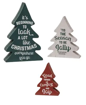 Spread the holiday cheer around the farmhouse with the Holly Jolly Chunky Wooden Trees, 3/Set. These chunky 1" depth wooden pine cutouts are finished in traditional Christmas colors of deep red, white and dark green. The red tree measures 4" high by 3" wide and reads ‘Have a holly jolly Christmas’ in white text and script. The medium tree is white and measures 5" high by 4" wide and reads ‘No place like home for the holidays’ in red script and text. The green tree measures 6" high by 4" wide and reads ‘We wish you a merry little Christmas’ in white script and text. These trees look lovely together or spread the cheer around to various displays with frosted greenery and berries, candles, and more.