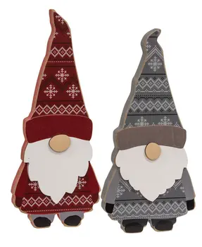 Jingle all the way into the cozy farmhouse with the Layered Wooden Sweater Gnome Ornament assortment. Topped with rusty jingle bells and wire loops, these layered wooden ornaments depict cute gnomes with warm sweater designs. One gnome has a red coat, hat and mittens and measures 6" high by 2.5" wide. The other has a gray hat and coat with black mittens and measures 5" high by 2.5" wide. These ornaments will add pattern and depth to the farmhouse Christmas tree.