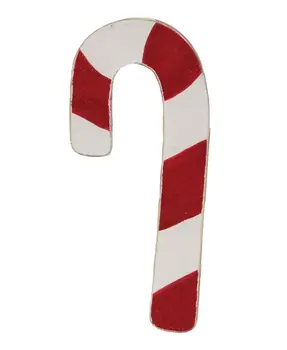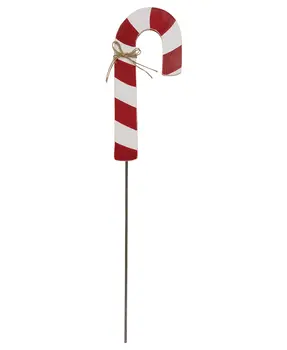 Bring precious peppermint notes to holiday decor with the Medium Candy Cane Planter Stake Topper. Measuring 10" high by 4" wide with a .5" depth, this wooden candy cane features red and white stripes, lightly distressed edges, and a double jute bow. It is finished on both sides and will add a pretty pop of color to the deep greens and frosty notes of Winter greenery. Metal stake sold separately.