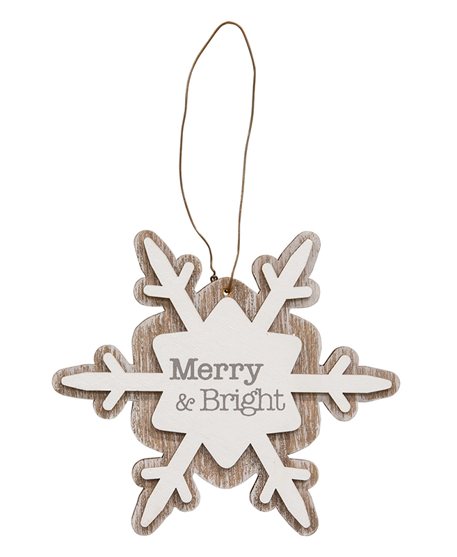 Add a bit of winter charm to Christmas tree displays with the cute Merry & Bright Layered Snowflake Ornament set. These layered snowflake ornaments have a distressed wood background with a white layer on top. Each ornament has a 4" diameter with a .25" depth and features a cute Christmas phrase in gray text. One reads, ‘Let It Snow.’ Another states, ‘Merry & Bright.’ The third reads, ‘Snowflake Kisses.’ They are all topped with a wire hanger for easy hanging. These ornaments will add pattern and depth to the farmhouse Christmas tree, wreath, or mantle.