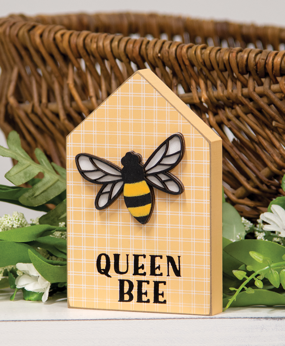 Bring a royal touch to the farmhouse with the Queen Bee Block Sitter. This wooden house-shaped sitter has a pretty soft yellow finish with white plaid and distressed edges. It sports a dimensional bee in black and bright yellow above the words ‘Queen Bee.’ This sitter will add warm color and depth to shelf or tray displays and looks lovely with daisy or sunflower florals. It measures 5.5" high by 3.5" wide with a .75" depth.