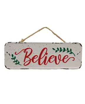 Measuring 7” high x 15 ¼” wide x ¼” deep, this festive wall art hangs by two sawtooth hangers and reads “Southern Pine,” “Christmas tree,” and “fresh cut free delivery.” “Christmas tree” is written in playful script and set next to a red-and-green illustration of a truck carrying a pine tree. The printed edges of this enameled sign convey an antiqued, rusty look that brings vintage style to holiday decor.