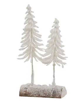 Add a touch of wintry wonder to displays this season with the Snowy Pine Forest on Log. Measuring 10" high by 8" wide with a 2" depth, this log features four trees with plastic green branches and topped with a generous coating of flocked snow from branch to base. It has a sturdy, half-log base with a dark wood finish that peeks out from the heavy snowfall. This log will make a great addition to classic or rustic Winter displays or situated among snowflake-themed décor.