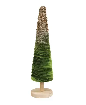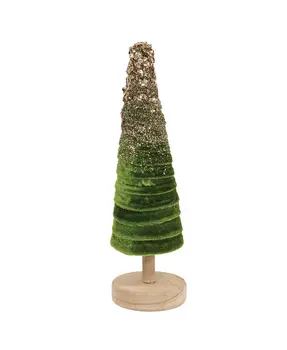 All that glitters is green and gold this season with the Sparkle Velvet Christmas Tree, 12"H. Made of a wooden base and wrapped in soft green velvet, this tree has a unique look that mixes classic Christmas with a bit of whimsy. The top is coated in gold glitter with a more coarse offering at the top fading into finer grain below. The tree is 3" in diameter and stands 12" tall. This festive tree will look lovely tucked in among a gathering of pillar candles and greenery.