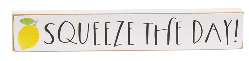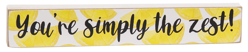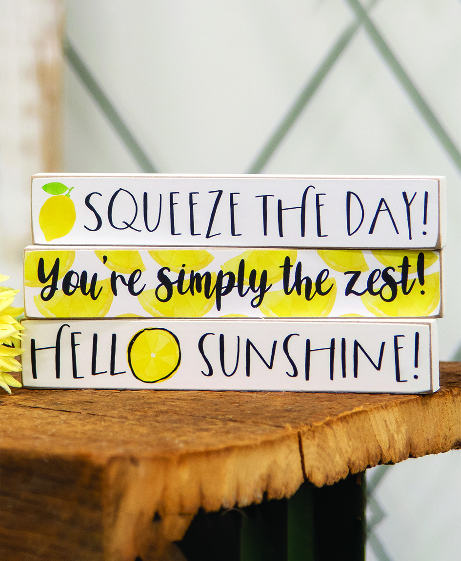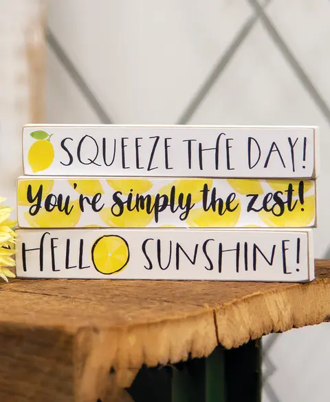 When life has you feeling squeezed, squeeze back with the Simply the Zest Mini Stick, 3 Assortment! Each mini stick gives bright and uplifting encouragement. Sayings, in jaunty type and script, are 'Squeeze the Day!', 'You're simply the zest!', and 'Hello Sunshine!'. Each mini stick measures 1" high by 6" wide and .5" deep.