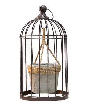 A rustic, cement pot is suspended by a jute rope and hook at the center of a large, 16” high x 8.5” diameter, washed-gray birdcage. The gray wash and lightly-distressed style of this quaint, tabletop accent makes a creative, lighthearted addition to the chic farmhouse. It looks great dressed up with a small houseplant or your a favorite artificial floral.