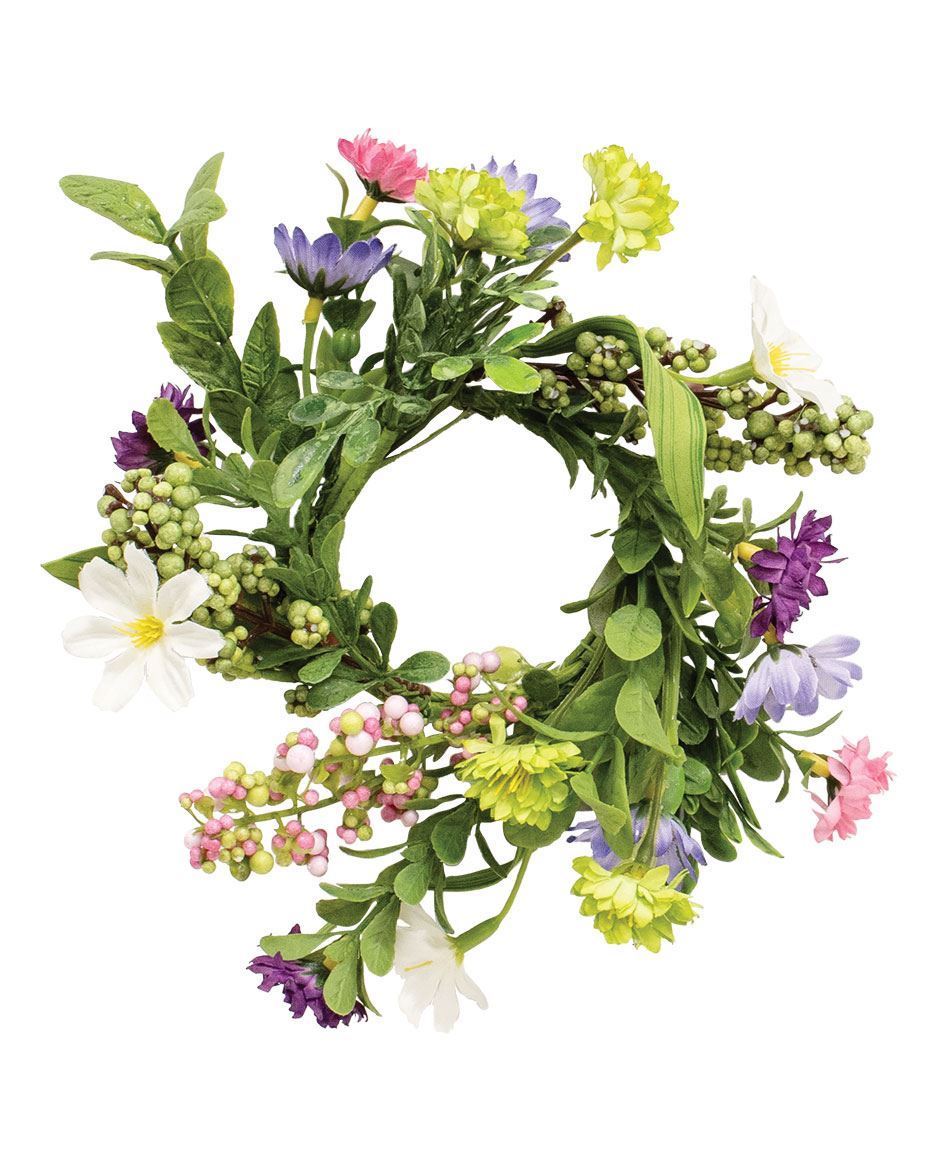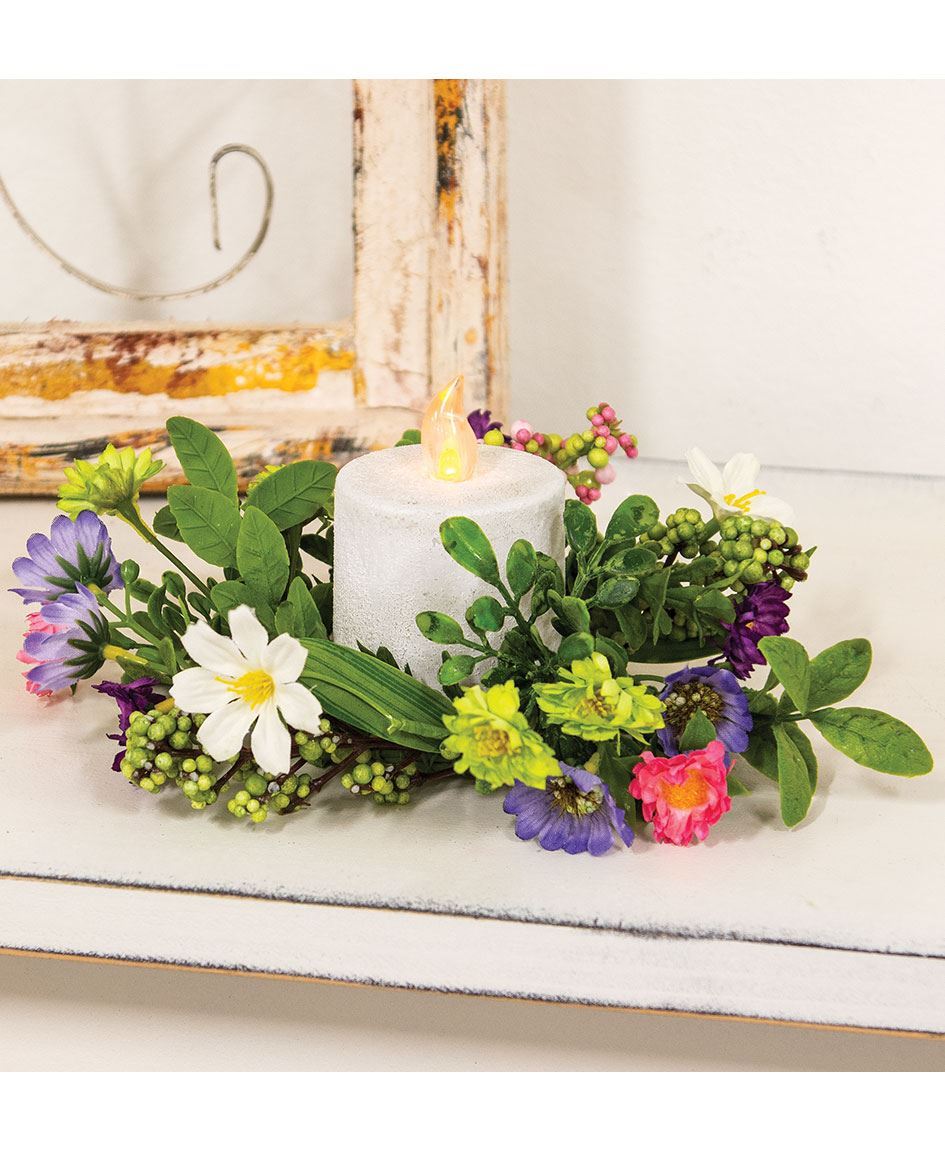 Wrap Springtime decor in floral charm with the Spring's Chorus Candle Ring, 2.5". This alluring ring has a wrapped wire base holding sprigs of rounded green leaves, pointed leaves with light flocking, and long foam leaves. Emerging from the greenery are white fabric flowers with spiky yellow centers, violet fabric flowers with fuzzy foam ball centers, and flowers with papery petals in purple, pink and green. Clusters of green foam beads finish off the piece which measures 2.5" on the inner diameter and roughly 6-8" on the outer diameter. Pair this ring with a flameless candle, candle holder, vase, or get more creative and fill the center with a gathering of faux eggs for a festive spring nest design!