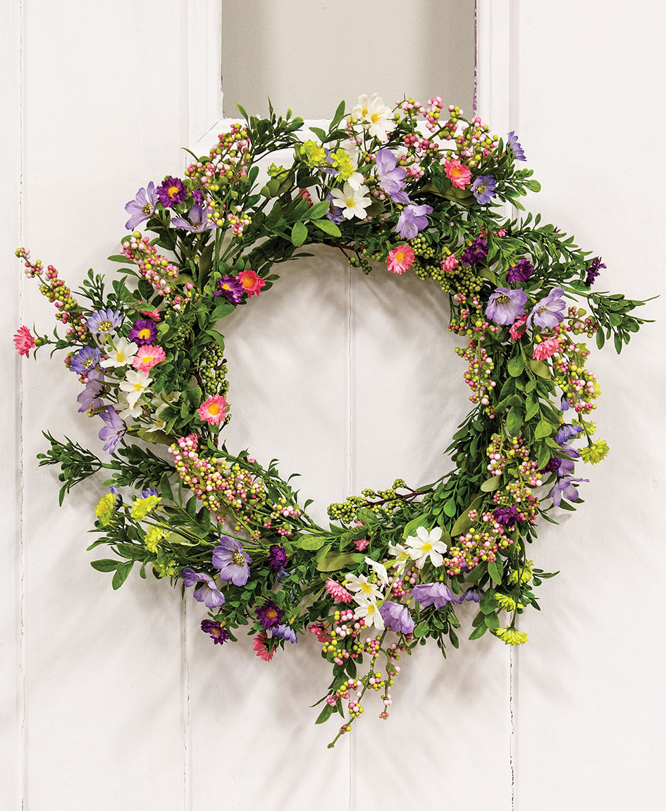A mix of beautiful textures and colors come together in the Spring's Chorus Wreath, 22" to create a look that is music for your eyes! Measuring 11" on the inside diameter and approximately 22-24" on the outside diameter, this wreath has a wrapped wire base in green. Various rounded plastic leaves in different styles mingle with pointed leaves and soft foam leaves. Small branches of foam bead buds appear in all green on dark stems and a mix of pinks and green on green stems. Small blossoms with pointed paper petals have fuzzy yellow centers and appear in dark purple and bright pink. Similar papery flowers in bright yellow-green have fringed yellow plastic centers. Fabric flowers in striking white and soft violet-purple add lovely contrast. This wreath is eye-catching on doors or hanging above shelf or mantle displays with Spring or Easter decor.