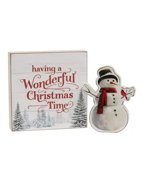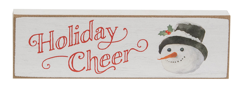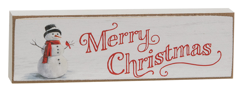 Add delightful vintage notes to the Winter farmhouse with the Vintage Season's Greetings Mini Block assortment. Measuring 1.5" high by 5" wide by .75" deep, these wooden mini blocks can be added to a variety of displays. They have a lightly distressed white background and edges and depict cute Winter figures with simple sayings in embellished text. One reads 'Merry Christmas' in red and shows a white snowman with black top hat, red scarf, and red cardinal perched on his stick arm. Another shows a close-up cardinal on a branch with holly and a pinecone. It reads 'Season's Greetings' in gray. The third shows the face of a snowman with pointy carrot nose and black top hat accented with holly and snow. It reads 'Holiday Cheer' in red. Add one of these blocks with a mini Winter tree and a pillar candle or two for an easy but pretty Winter arrangement.