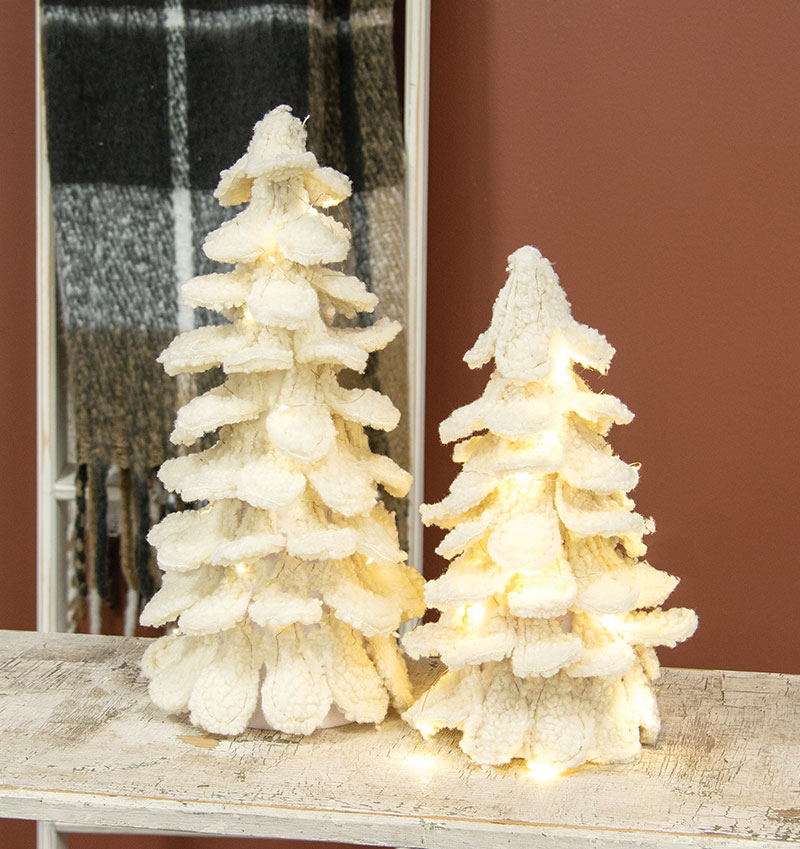 Bring fluffy snowy texture to Winter farmhouse displays with the White Sherpa Christmas Tree, 17.5" H. This darling tree is made of soft white sherpa fabric and measures 17.5" high with a 6.5" diameter. The stitching on the branches of this tree gives a lovely note of subtle contrast to the white fleece for an extra touch of character. This tree will look beautiful as part of a Christmas centerpiece with candles, beads, and bud lights.