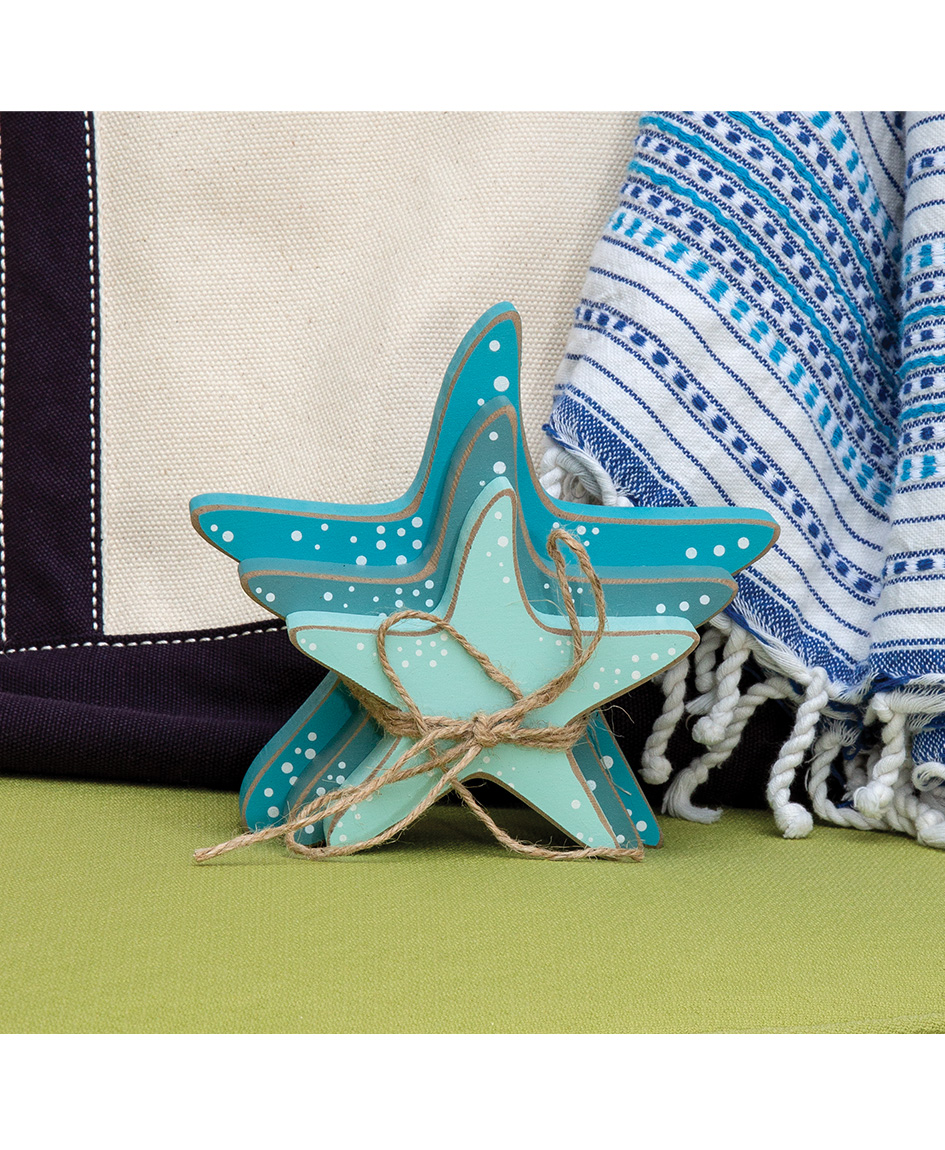 "Sea" the beauty of Summer farmhouse displays increase with the Wooden Starfish Bundle, 3/Set. This set of three wooden sea stars comes in three shades of blue-green with white dotted accents and distressed edges. The small star measures 4.5" high by 4" wide while the medium star is 5.5" by 5" wide. The large is 6.25" high by 6" wide and all three have a .75" depth. These stars will really bring the feel of the beach to displays when paired with dried straw accents, our jute-tassel bead garlands, or one of our rope wrapped jars.
