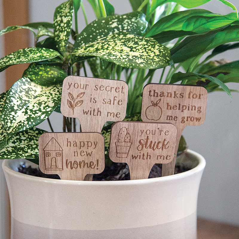 Talking to plants can help them grow and now they can talk back with the You're Stuck With Me House Plant Poke assortment! These wooden plant stakes feature four charming designs in wood-burn style, and they measure 6" high by 2.5" wide. One stake reads ‘your secret is safe with me’ with a stem and leaf design for all plant-confidants. Another states ‘thanks for helping me grow’ with a depiction of a fruit. A cute potted cactus accents the phrase ‘you’re stuck with me’ on another. And the last shows a cute house image and reads ‘happy new home!” These stakes add a little fun and humor to house plants and make a great addition to a potted plant gift.